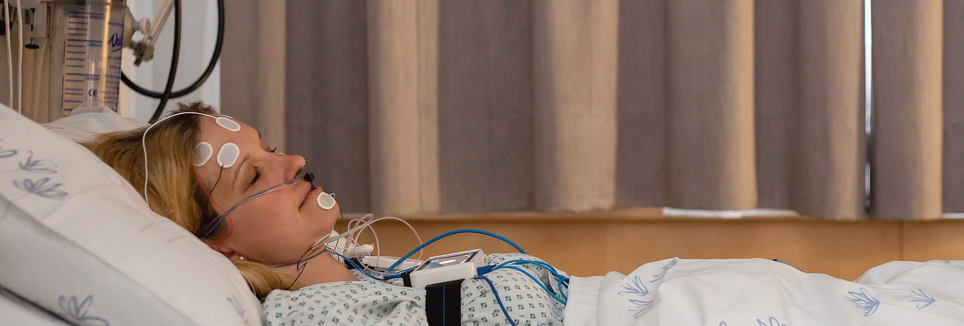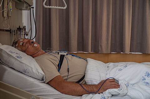 Während Sie schlafen, messen wir Gehirnströme, Augen- und Kinnbewegungen, den Sauerstoffgehalt im Blut, die Körperlage und Beinbewegungen, die Brust- und Bauchatmung und nehmen lungenspezifische Messungen sowie ein EKG (Elektrokardiogramm) vor.